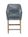 Modern lines convey a contemporary flair in this pair of counter height stools. Breathable and stylish, each counter height stool features a main seat frame wrapped in a woven rope design. Lending a rustic farmhouse flair are weathered Asian hardwood legs, square and slightly tapered toward the foot. The rope like design also lends a nautical inspired vibe, perfect for coastal beachside cottages. In addition, each stool features supportive foot braces and a padded seat cushion.