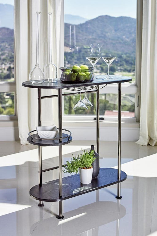 Coaster Z2 PremiumModern bar unit with top and shelves finished in black oak Metal frame electroplated in polished black nickel Features a middle bottle shelf with...