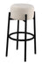 Casual with sleek lines, slide this pair of contemporary stools up to a bar or kitchen breakfast area. Designed with a thick pouf like cushion wrapped in a white upholstery, this stool lends an elegant playful charm to any space. The pouf inspired seat rests nestled between an extension of the minimal style, sleek modern frame. Presenting a stark contrast in color, each two tone stool presents a white seat cushion held by a black finish frame. Four slim side supports lift the round cushion, offering rest and relaxation with a matching round brace that acts as a footrest.